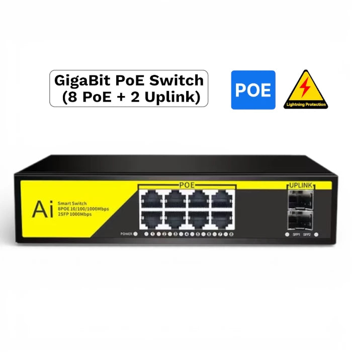 - 10 Ports Total: 8x PoE RJ45 + 2x Uplink RJ45