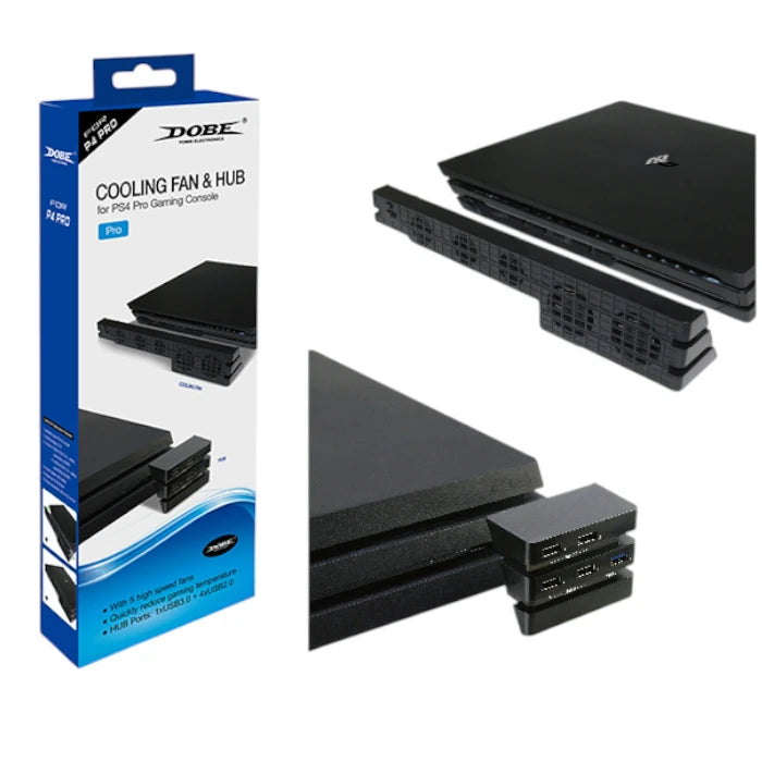 The DOBE P4 Pro Cooling Fan is a clip-on external fan accessory designed for the PlayStation 4 Pro console. It attaches to the console to help improve airflow and reduce heat buildup while gaming.
